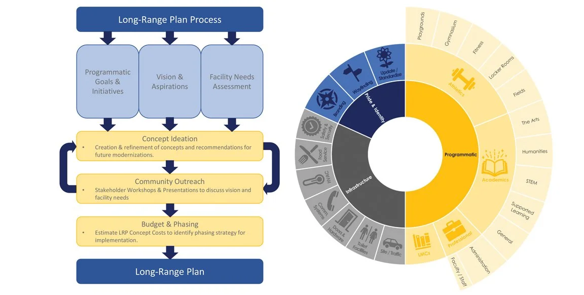 The effort for the Long-Range Facility Plan for the district was a participatory process with multiple scales of interactions and information gathered. This approach afforded the district the benefit of broad stroke visioning as well as focused input and evaluations to best align the potential projects with the holistic needs of the facilities. The team conducted facility walkthroughs to assess school conditions using a trauma-informed design framework, evaluating how the physical environment impacts student and staff experiences. Building on this assessment, we facilitated an analysis of potential project scopes with district leadership, prioritizing ideas based on impact and feasibility through collaborative workshops. The resulting framework organized projects into tiers of priority to guide future capital planning, ensuring improvements address infrastructure, educational goals, and the overall quality of the learning environment.