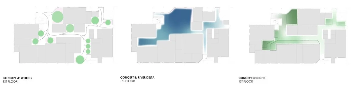 Multiple iterations of test fits were then generated, responding to different organizational strategies and design drivers and refining the complex spatial relationships between different program areas. The resulting space plan allows each academic program their own space and resources but encourages interaction within and between departments through adjacencies and the incorporation of thoughtfully placed lounge spaces that support different levels of privacy, collaboration, and activity based on student preferences. Ultimately, these strategies seek to increase student engagement, recruitment, and retention, to support the needs of faculty and staff, and to transform the building into a dynamic hub for science education.